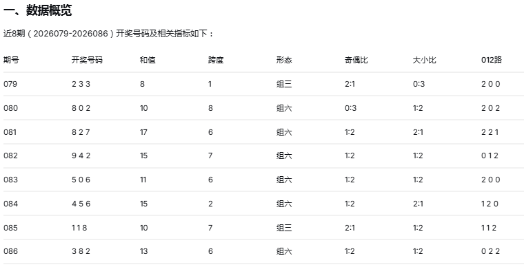 组三出现2期(079期2 3 3,085期1 1 8),占比25%。组三间隔5期(079→085),对子数字分别为3和1,均为小号。组三后一期往往转组六且跨度较大(079后080跨度8,085后086跨度6)。下期(087期)组三概率较低,但仍需防。