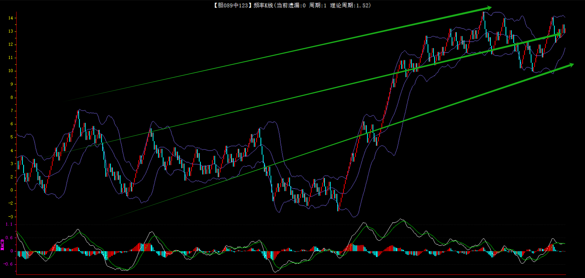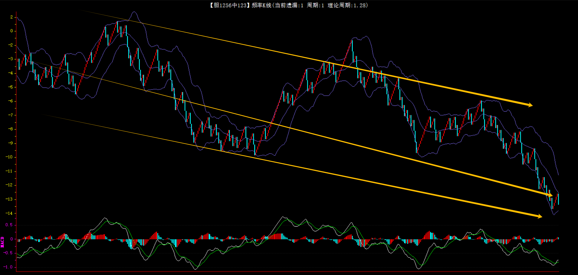 整体趋势下行,上边沿线趋势向下,下边沿趋势也是向下,节点震荡,当前遗漏1期,本期防守。