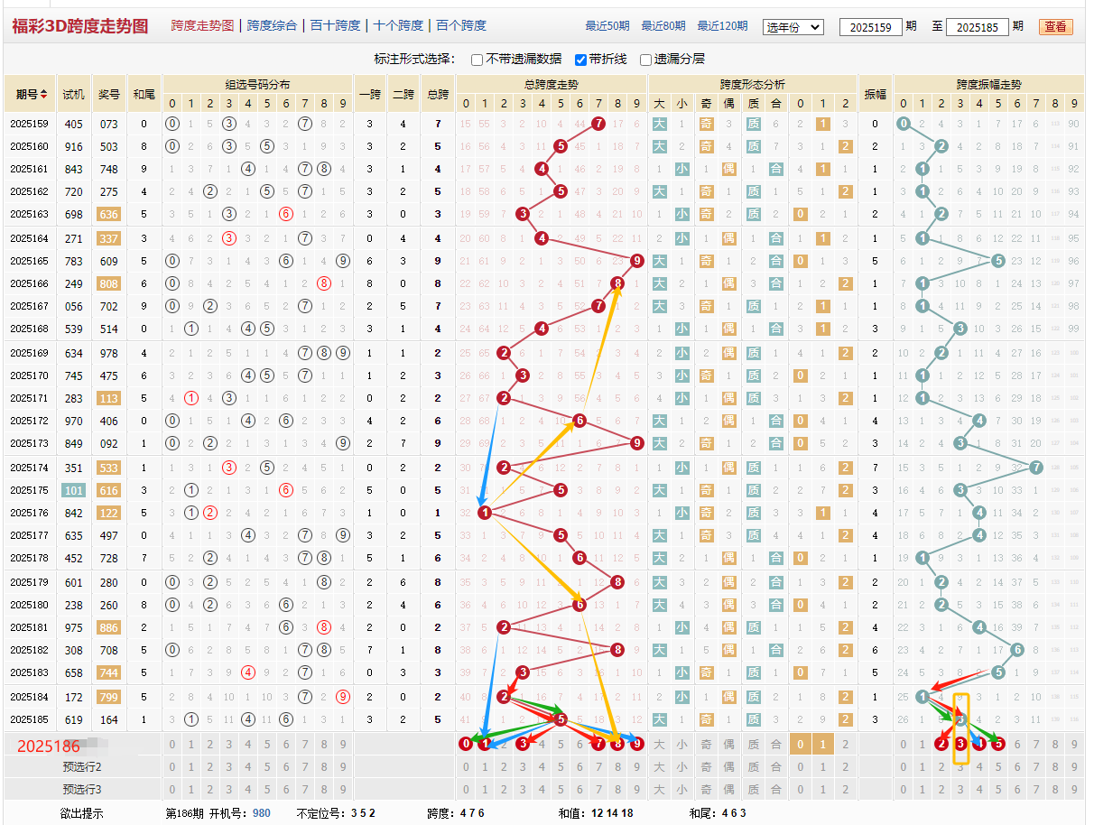 上期开出质奇5跨,近期跨度开出326 925 156 862 832 5,连续近16期268跨出了9期很热,大家看上图红色线183-186期3/2/5/7和上面 157-154期3/2/5/7走势同指向7跨,这个7跨是重点方向,如果按振幅1-3-4振幅走今天得考虑大跨度9和小跨度1的组三。振幅走等格1-3-5小防下今天0跨(个人看法)。结合012路和振幅来看01路37重点关注,186期推荐跨度:37810