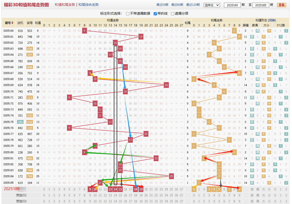 上期开出164和值11和,近期奇数尾热本期重点还看奇数尾,从182-180期尾走势看528,184-186期尾走势519这个9尾今天重点关注。按和值守恒原则本期和值不会太大,考虑中小和值。大家再看上图绿色线挑标记的13和值,178期17和值,182期15和值,186期13和值等格下来,其次就是181-179期22/8/10和184-186期25/11/13也是同样的形态,186期推荐和值:9 13 14 19 10