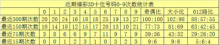 最近15期奖号由冷到热表现为:0、1、6→0次,2、5→1次,3、8→2次,4、7、9→3次,奖号奇偶比为9:6,大小比为9:6,012路比为5:6:4。