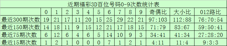 百位分析:最近300期奖号由冷到热表现为:5→22次,3→25次,0、2→26次,1→27次,9→32次,4→33次,6→34次,8→35次,7→40次,奖号奇偶比为146:154,大小比为163:137,012路比为117:100:83。