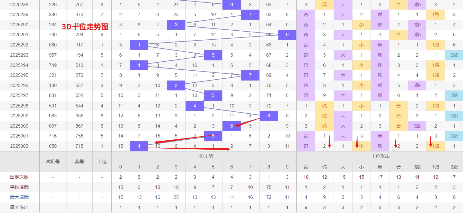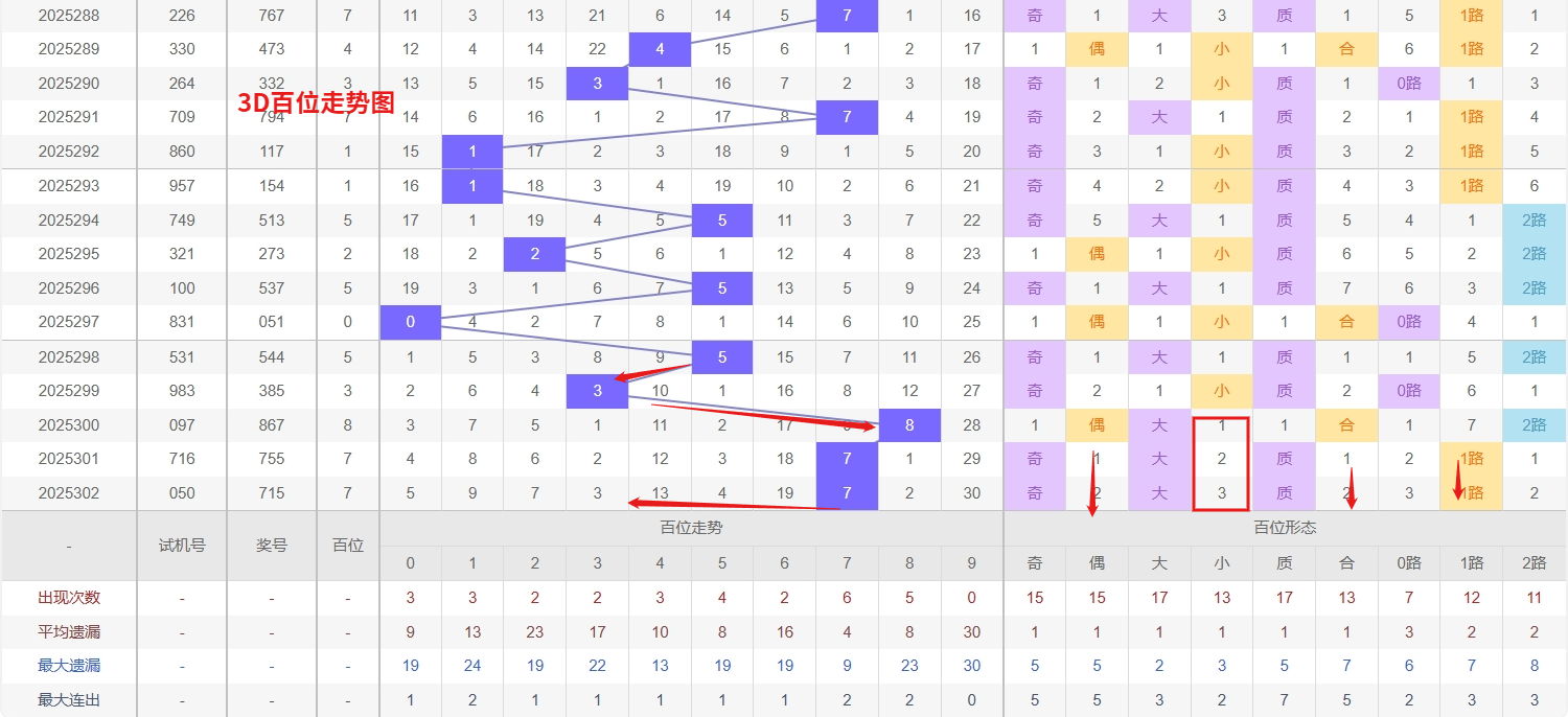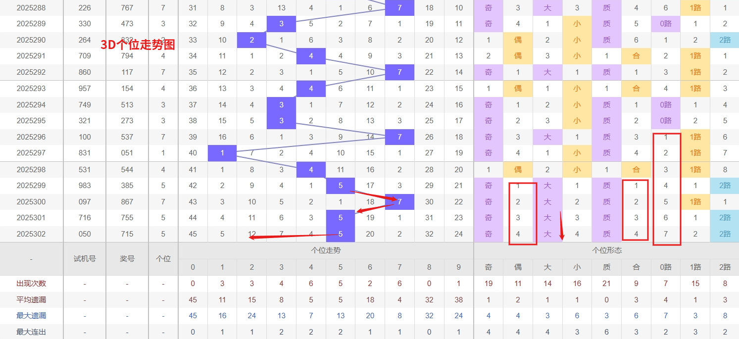 福彩3D个位分析:第2025302期个位开出号码5属于大奇数中端,从以上个位走势图中可以看出近100期的大小比约为48:52奇偶比约为51:49大小奇偶数据上有点差异有需求但不是太明显,不太好看这时就要借助连线走势和遗漏数据来帮助我们缩水号码。上期个位落号“5”大奇数2路号码球,号码开出了0振幅,连续多期的大振必被小振幅取代幅符合我们的预期,那么本期我们在个位考虑振幅走势走前依然要转变思路考虑大振幅,具体考虑(2-5)个振幅是我们主要的方向,那么在对个位落号情况进行系统的分析时我们可以明显的看到个位号码走势呈现大范围震荡,尤其是在号码的落位特点上表现的尤为突出,那么本期我们在个位分析时就要注意号码的风险,避免出现踏空。近期3D个位走势的跟踪分析,号码7呈现出明确的热态特征,其出现频率显著偏高且出号节奏较为连贯,从热号惯性规律判断,短期内这一号码仍有较大概率持续表现;与此同时,号码0和8则双双陷入深度冷态,两者的遗漏周期均已远超理论值,在关注热号7延续态势的同时,对冷号0和8的联合回补保持高度警惕,因此福彩3D第2025303期个位看好02478。