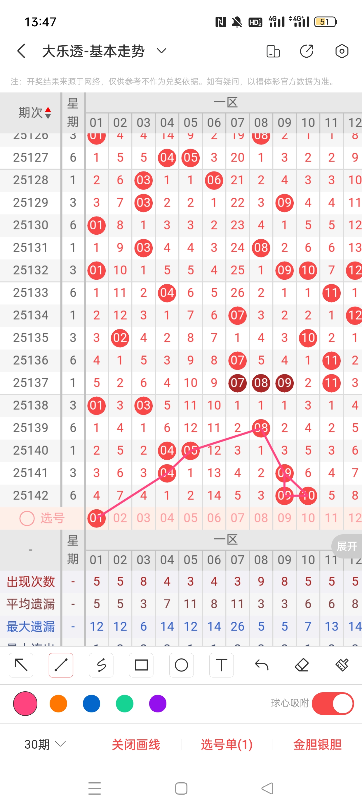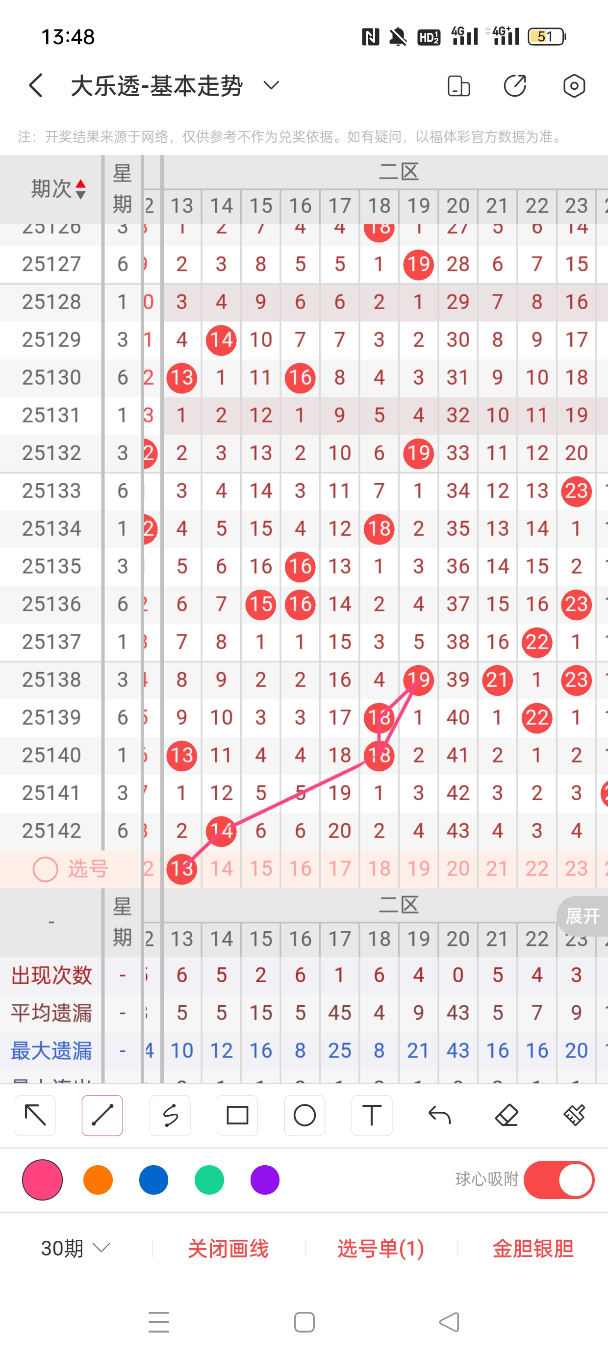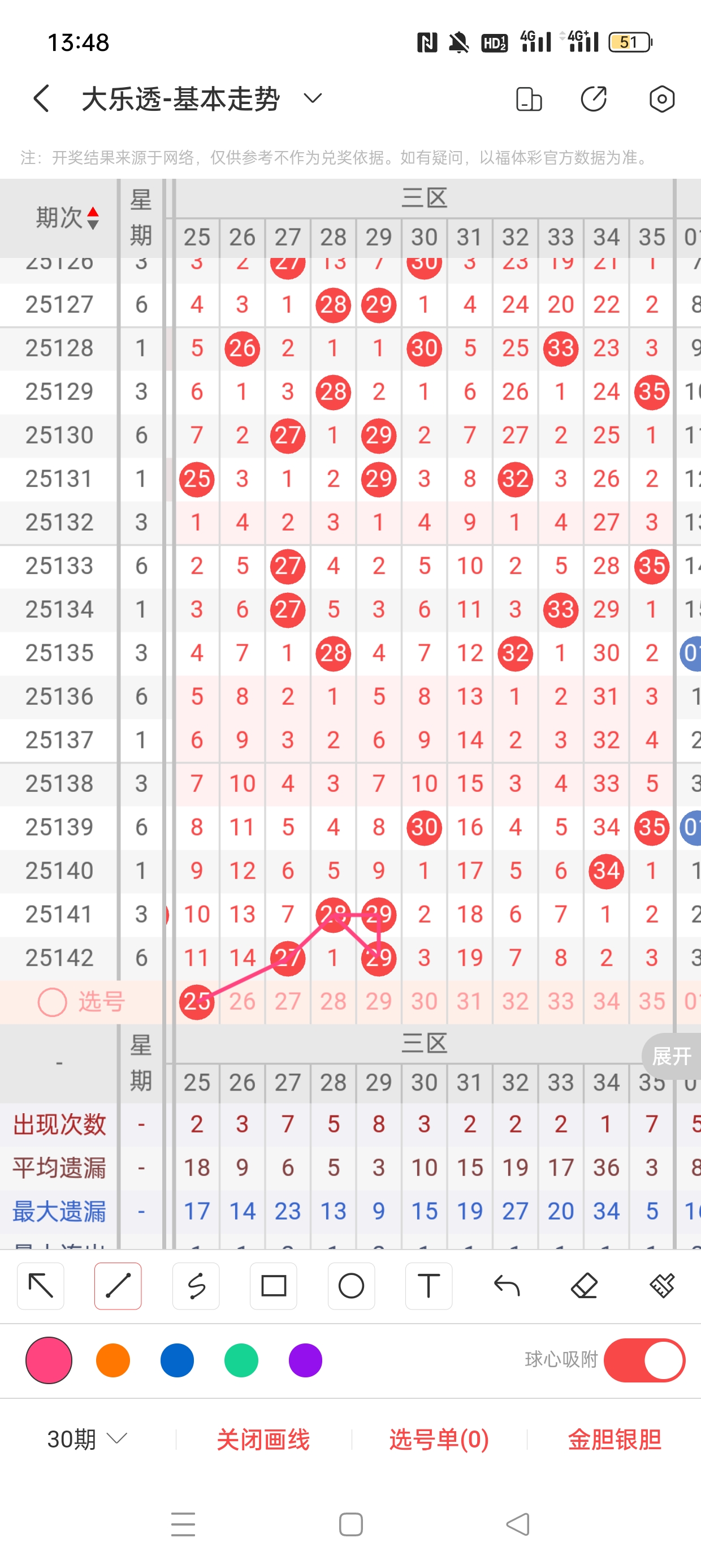 三区(25-35)近131期本区邻孤传57邻102孤10传,孤号热度高,本期着重邻传。近131期本区012路46:55:68,2路热度高,本期着重0/1。25已遗漏11期,与27之间呈现向左遗漏递减态势,需防。