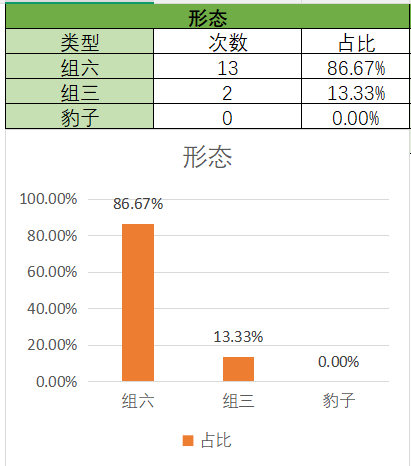 上期开的是组六,其中组六占比变大,组三占比变小。通过图示可以看到,组六在15期内开了13期,组三开了2期。本期关注组六,防组三。