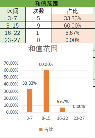 上期和值是10,处在8~15之间,其中8~15占比变大,16~22占比变小。目前是8~15占比最优,其次是3~7,最后是16~22。本期看好和值在8~15之间,其次是16~22。