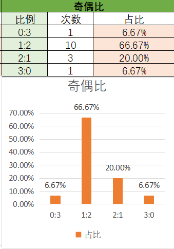 上期奇偶比为2:1,各个类型占比没有变化。近15期内1:2优势最大,其次是2:1,然后是3:0和0:3。上期开了2:1奇偶比,本期还是看好2:1奇偶比的开出,其次是1:2。