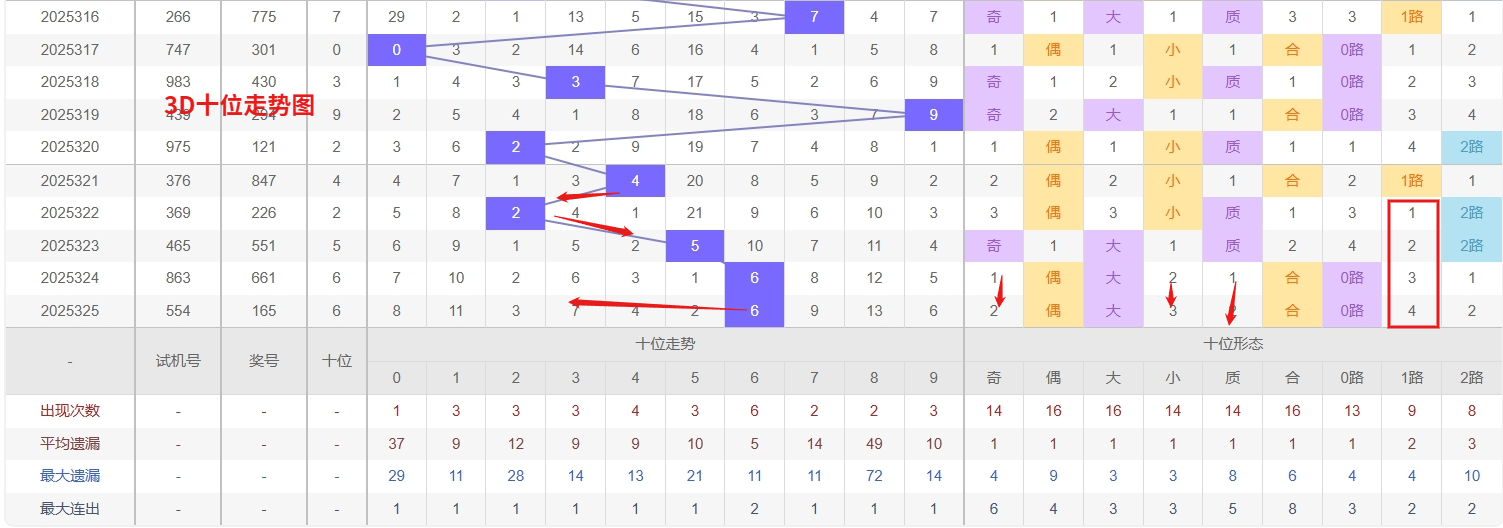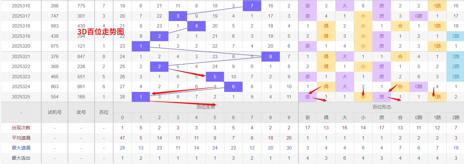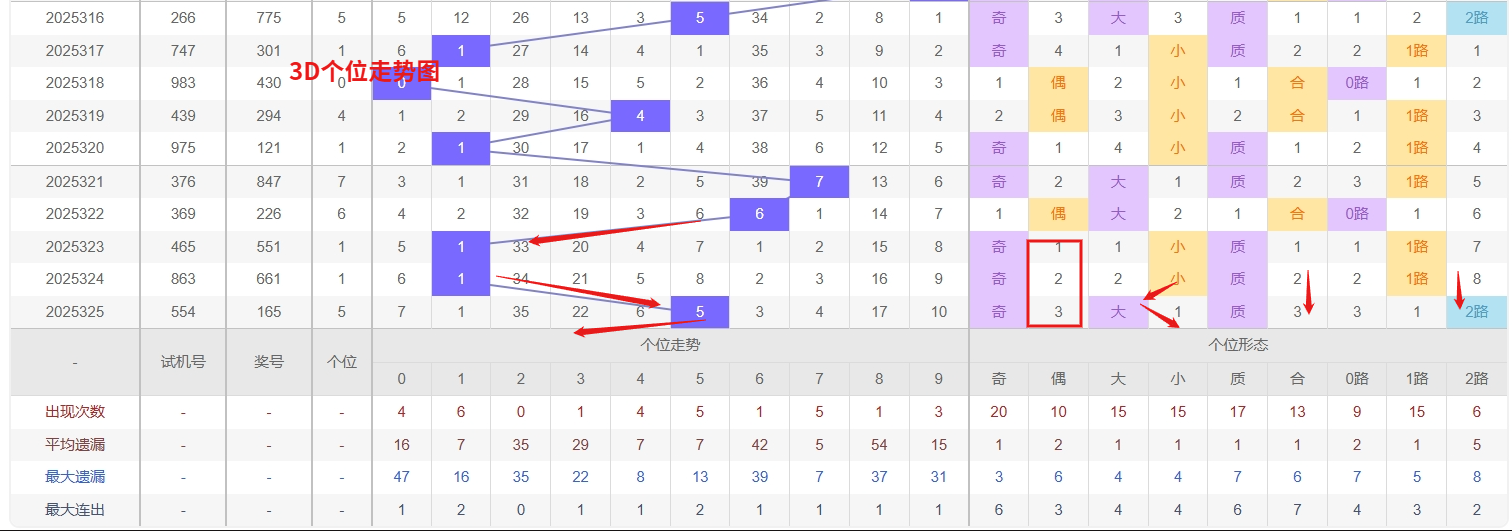 福彩3D个位分析:第2025325期个位开出号码5属于大奇数中端,从以上个位走势图中可以看出近100期的大小比约为45:55奇偶比约为51:49大小奇偶数据上有点差异有需求但不是太明显,不太好看这时就要借助连线走势和遗漏数据来帮助我们缩水号码。上期个位落号“5”大奇数2路号码球,号码开出了4振幅,连续多期的大振必被小振幅取代幅符合我们的预期,那么本期我们在个位考虑振幅走势走前依然要转变思路考虑大振幅,具体考虑(2-6)个振幅是我们主要的方向,那么在对个位落号情况进行系统的分析时我们可以明显的看到个位号码走势呈现大范围震荡,尤其是在号码的落位特点上表现的尤为突出,那么本期我们在个位分析时就要注意号码的风险,避免出现踏空。3D个位走势,冷号2和8的遗漏周期已逐步拉长,呈现出明显的回补压力。尤其是2在长期冷态下接近临界点,反弹势能正在积聚;而8虽间隔稍短,但同样在冷区波动,具备周期性回补的条件,两者均需关注其可能出现的转折信号。与此同时,热号0近期表现活跃,综合来看,个位布局应在追踪冷号2、8回补机会的同时,对热号0的持续热度保持适度防守,因此福彩3D第2025326期个位看好02368。本文由一起彩钱是生命动力所著,请勿转载