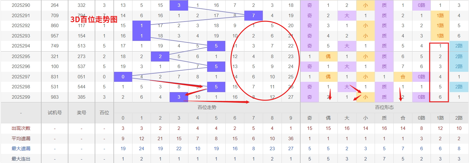 福彩3D百位分析:第2025299期百位开出号码3属于小奇数,从上面百位走势图上可以看出近100期大小比约为48:52奇偶比约为47:53。近期数据还是比较极端的符合文章开头介绍的求均衡规律非等量现象。但这种均衡不会持续最终会被偏态运行打破,然后循环往复。但短期内大小相差2点,大数过热小数有回补需求本期个人认为走小数的概率更高。上期百位落号“3”号球,在百位号码开出0路号码3后向小数方向走出2个振幅。那么通过分析上期百位落位号码分析,号码走出2个振幅,号码走为小奇数,开出0路号码3。通过对百位落号趋势来分析,百位号码落位前端,通过对近10期的走势来看百位号码大小交替频繁走3期大数又走2小数,近期3D百位走势的冷热号分布来看,目前热号7在短期内频繁出现,显示其正处于强势周期,而冷号9已多期未见回补,从概率均衡的角度分析,冷号9的回补压力正在逐步累积。热号7由于近期过热,后续可能会逐渐降温,出现频率将有所回落;而冷号9虽然目前处于遗漏状态,但历史数据表明,任何一个号码都不可能长期隐匿,随着开奖次数的增加,冷号回补的概率将显著上升。因此,在接下来的开奖中,热号7可能还会短暂延续热度,但冷号9的回补机会正在不断增强,可适当关注冷号9的反弹,同时留意热号7的持续动能是否减弱,我们在百位关注的重点在01679这5个号码球上,百位号码近期奇偶切换频繁,3号球码属于0路号码奇数,现奇数开出过多有继续向奇的趋势。所以福彩3D第2025300期百位看好01679。本文由一起彩钱是生命动力所著,请勿转载