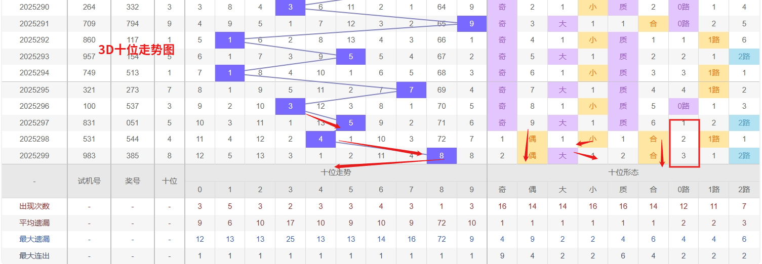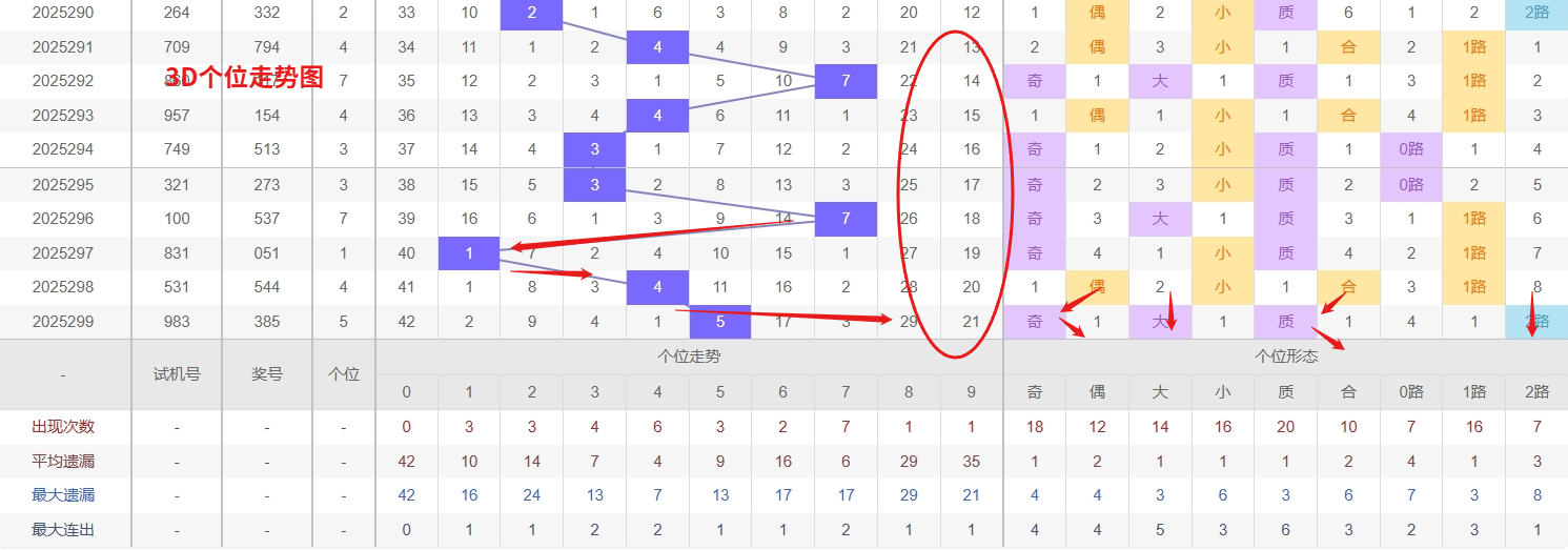 福彩3D个位分析:第2025299期个位开出号码5属于大奇数中端,从以上个位走势图中可以看出近100期的大小比约为55:45奇偶比约为53:47大小奇偶数据上有点差异有需求但不是太明显,不太好看这时就要借助连线走势和遗漏数据来帮助我们缩水号码。上期个位落号“5”大奇数2路号码球,号码开出了1振幅,连续多期的大振必被小振幅取代幅符合我们的预期,那么本期我们在个位考虑振幅走势走前依然要转变思路考虑大振幅,具体考虑(1-6)个振幅是我们主要的方向,那么在对个位落号情况进行系统的分析时我们可以明显的看到个位号码走势呈现大范围震荡,尤其是在号码的落位特点上表现的尤为突出,那么本期我们在个位分析时就要注意号码的风险,避免出现踏空。当前3D个位走势的冷热分布分析,号码0和8均已进入较长的遗漏周期,冷态特征十分明显。从概率均衡的底层规律来看,任何一个号码都不可能无限期地隐匿,随着开奖期数的递增,其回补的压力正持续累积并接近临界点。历史数据也反复验证,这种长期冷号一旦结束遗漏,往往不会仅仅出现一次,很可能会开启一个短暂的“复出”周期,因此需要对它们的反弹给予高度重视。在接下来的投注中,将个位的防守重点放在冷号回补上,尤其关注0和8可能出现的轮动开出,因此福彩3D第2025300期个位看好03689。本文由一起彩钱是生命动力所著,请勿转载