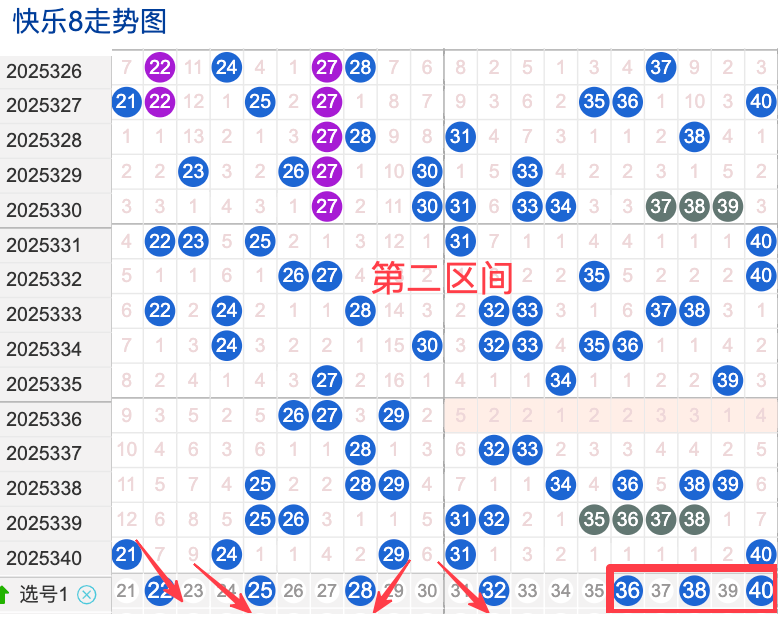 上期二区开出5个奖号(21.24.29.31.40)上期回顾二区开出5个奖号二区间在上期落位同比前期的话呈现了一个递减的落位趋势,先来看本期号码22整体活跃度较温热,在近 30 期里有一定的间歇性出现,不是每期都开,近期整体走势稍微稳定。号码25近期热度较热,间隔性比较好,说明其在当前阶段活跃度较热注意防守。号码32近期活跃度较热,有一定的间歇性近期整体走势相对平稳没有特别明显的冷热趋势变化,号码40近30期内活跃度较热,没有明显的连续出现形态走势,整体表现比较动荡还是很稳定。
