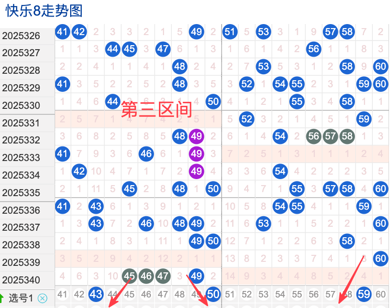 三区间开出了4个奖号(45.46.47.49)上期回顾三区开出4个奖号上期的三区间的奖号数量呈现一个递增的形态,4头回补4个,本期先来看号码43近期出现频率相对来说还不是很稳定。偶尔有时间隔期数也是很长,说明其在近期的开奖中较温冷的,号码50在近 30 期内出现次数相对还是稳定的号码,近期的活跃度也是较热。号码51有一定的间歇性,通常间隔5-10期会出现一次,没有明显的连续出现态势,走势相对较冷,在整个第三区间的表现本期还是可以防守的。号码59走势相对近期较热,近期没有连续间隔落号的情况,活跃度近期处于较热状态注意防守。