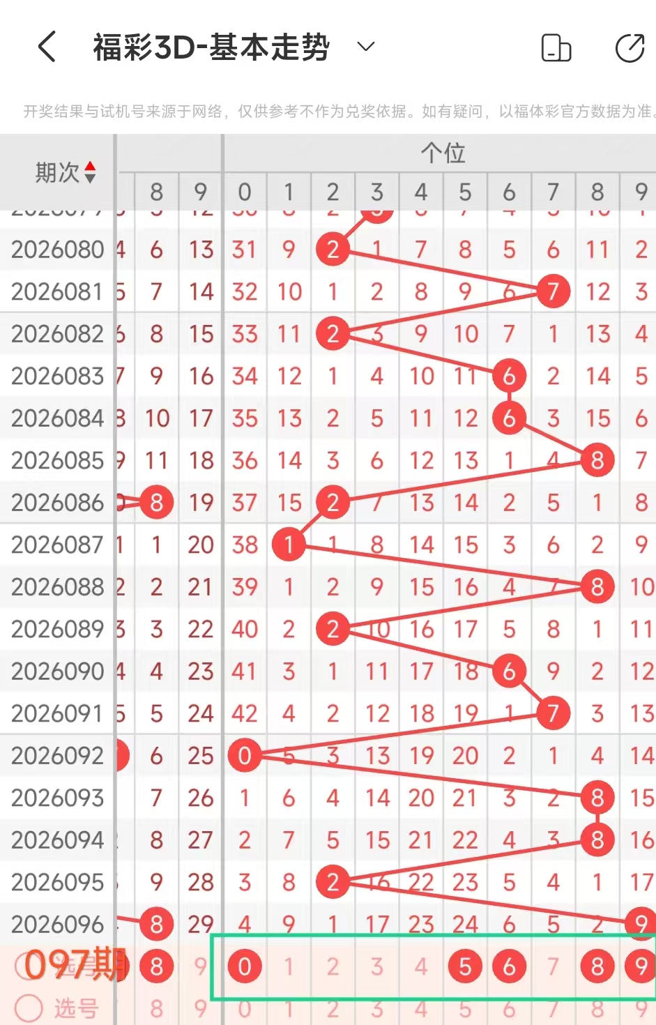 我们选取上期开奖号码689、在一起彩APP上截取前100期的数据,分别记录当开出6、十8、个9、后下期开出什么号记录下来,然后一一分析。