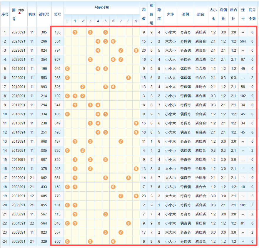 1、统计往年同期开奖号码