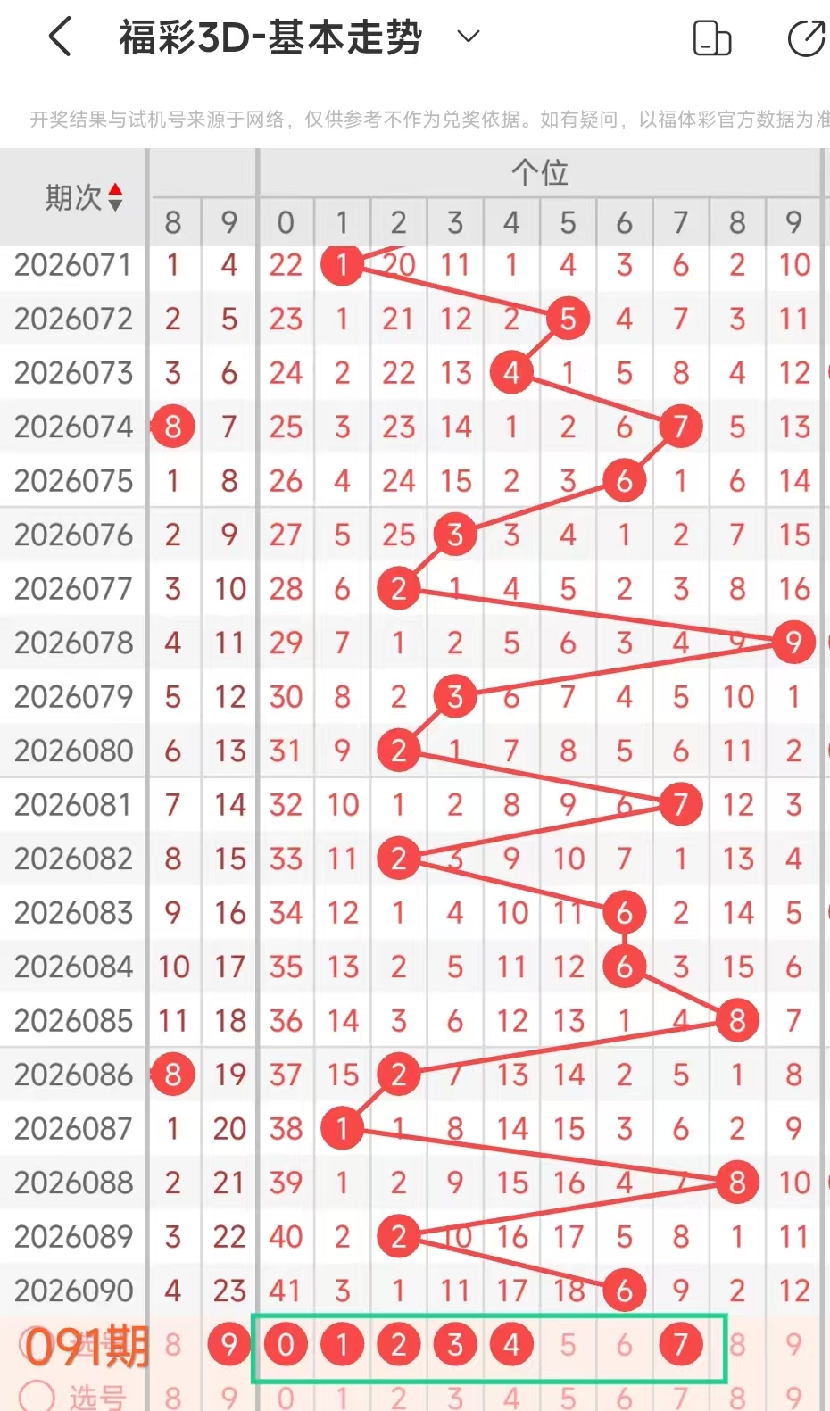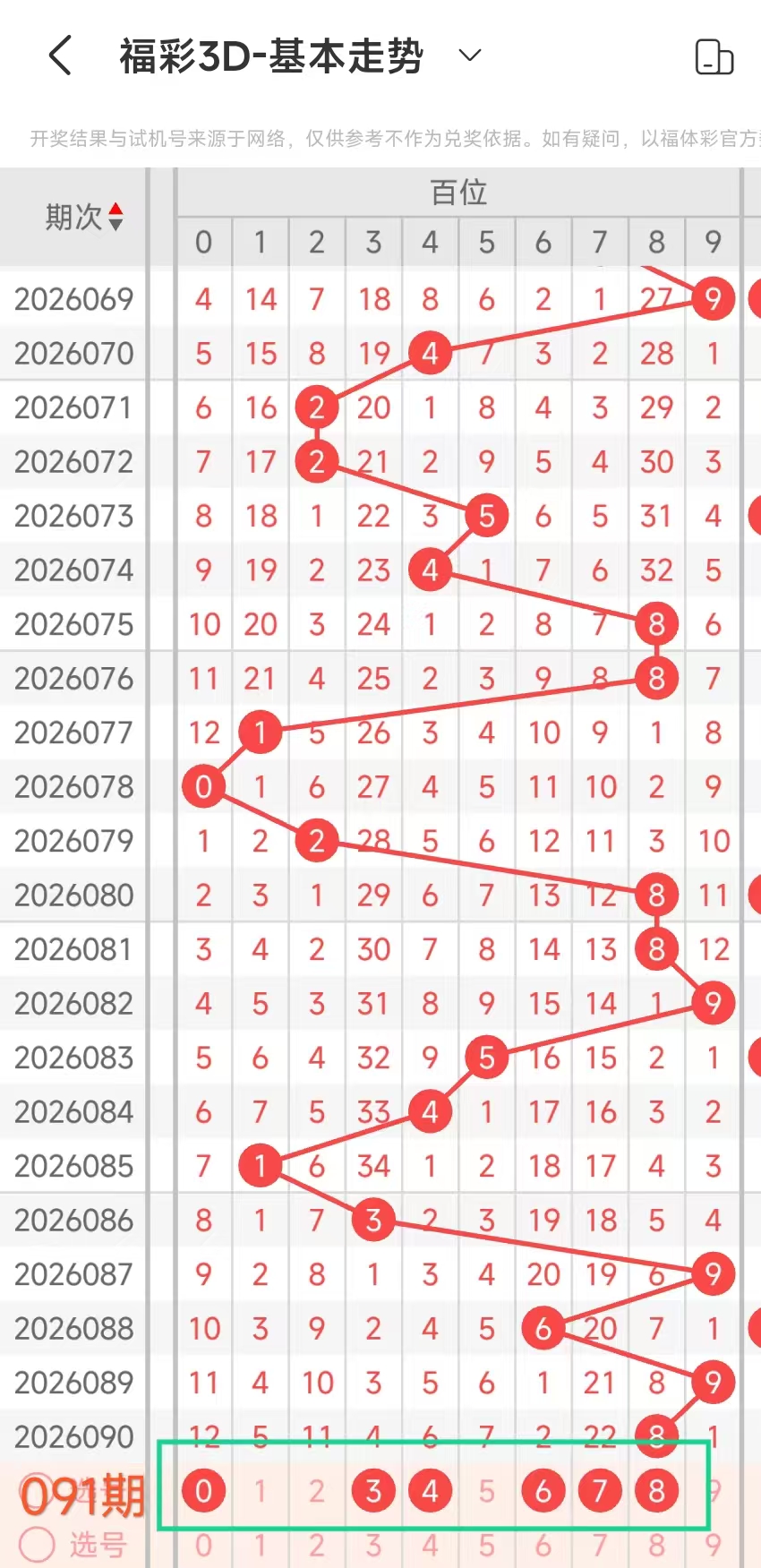 我们选取上期开奖号码816、在一起彩APP上截取前100期的数据,分别记录当开出8、十1、个6、后下期开出什么号记录下来,然后一一分析。