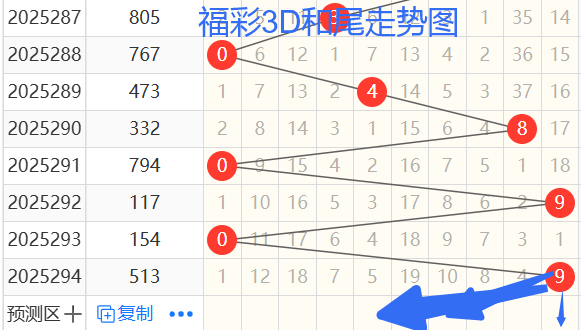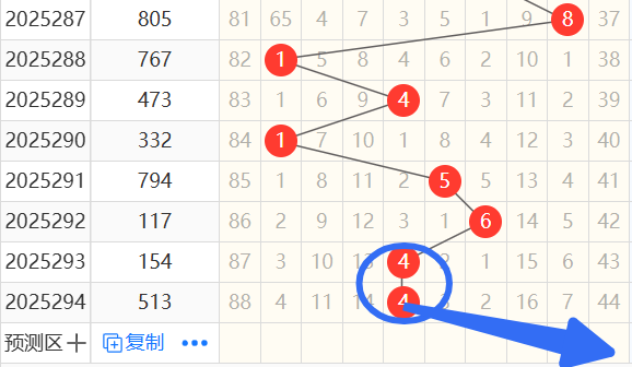 2)我们来看跨度;还是以290期——294期为例,如图依次是15644跨度,按照路数转换关系来看,那么跨度我们暂定258369跨 ,本期个人比较看好3 9 跨。