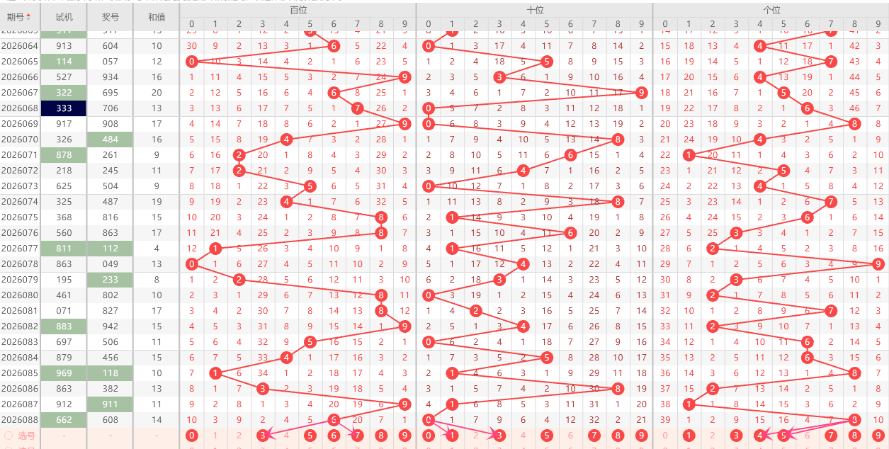 百位上期开出号码6,大数,偶数、百位近5期开出号码为:4-1-3-9-6,从近5期看84期遗漏为9,85期遗漏为7,86期遗漏为34,87期遗漏为4,88期遗漏为20,本期号码关注遗漏号码3、7,大小数走势为小小小大大,小号码走热,本期继续关注大数开出,奇偶走势为偶奇奇奇偶。奇数形态走热,注意偶数开出。本期百位推荐:0-3-5-6-7-8-9,