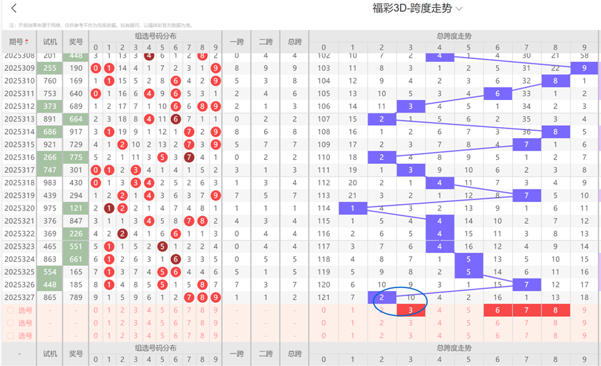 通过观察跨度及跨度属性走势可以发现:近10期内跨度09等号码遗漏值高,出号机会少,本期跨度开出09等号码的可能性小,因此本期跨度选号时可以优先排除09等号码。结合上述跨度走势图来看,本期跨度看好3678等号码。