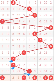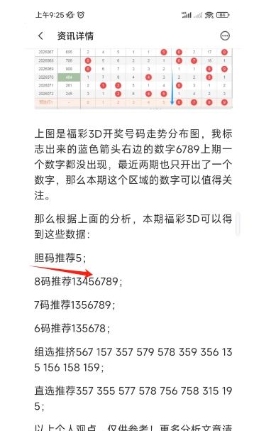上图是福彩3D开奖号码走势分布图,我在上面标志出来的蓝色箭头右边数字6789已经连续两期没出现号码,最近3期也只开出了一个数字,那么本期这个区域的数字可以关注出一个或者两个。