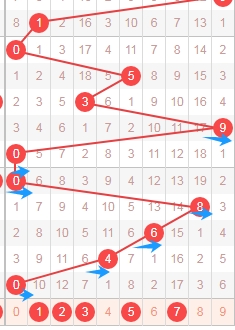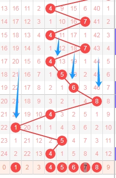 上图是福彩3D从左到右定位第三个数字走势图,我标志出来的数字都是遗漏周期小的,标志出来的蓝色箭头都是遗漏周期,根据这些遗漏周期来分析的话,本期第三个数字可以关注出遗漏周期小的数字145678,个人最看好数字678。
