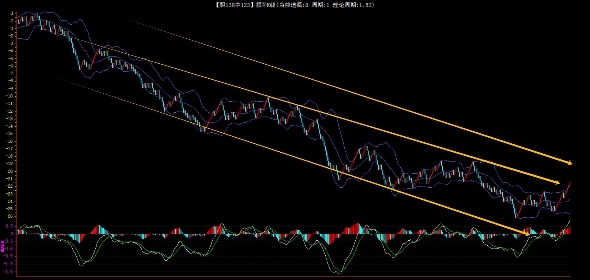 整体趋势下行,上边沿线趋势向下,下边沿趋势也是向下,节点震荡,当前连开6期,本期防守。