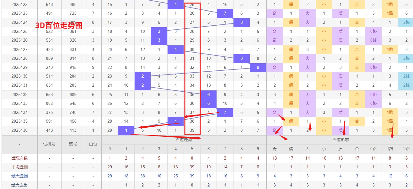 福彩3D百位分析:第2025136期百位开出号码1属于小奇数,从上面百位走势图上可以看出近100期大小比约为48:52奇偶比约为54:46。近期数据还是比较极端的符合文章开头介绍的求均衡规律非等量现象。但这种均衡不会持续最终会被偏态运行打破,然后循环往复。但短期内大小相差3点,大数过热小数有回补需求本期个人认为走小数的概率更高。上期百位落号“1”号球,在百位号码开出1路号码1后向小数方向走出3个振幅。那么通过分析上期百位落位号码分析,号码走出3个振幅,号码走为小奇数,开出1路号码1。通过对百位落号趋势来分析,百位号码落位前端,通过对近10期的走势来看百位号码大小交替频繁走3期大数又走2小数,最近大数比较强势,本期有走向大数号码的概率。那么本期我们在对百位号码进行分析时我个人的考虑百位号码会走出大数号码球,近期3D百位走势中,数字0和5持续低温,遗漏值已逼近历史极值,回补需求强烈,需重点防范其触底反弹。与此同时,数字4和6近期出号频率明显提升,呈现量价齐升的转暖信号,尤其6在间隔周期后多次回补,有接棒成为新热点的潜力。采用"守冷追温"的复合策略,在4、6的升温通道中捕捉短线机会,同时对超冷号0、5进行防守性布局, 我们在百位关注的重点在45069这5个号码球上,百位号码近期奇偶切换频繁,1号球码属于1路号码奇数,现奇数开出过多有继续向奇数的趋势。所以福彩3D第2025137期百位看45069。本文由一起彩钱是生命动力所著,请勿转载