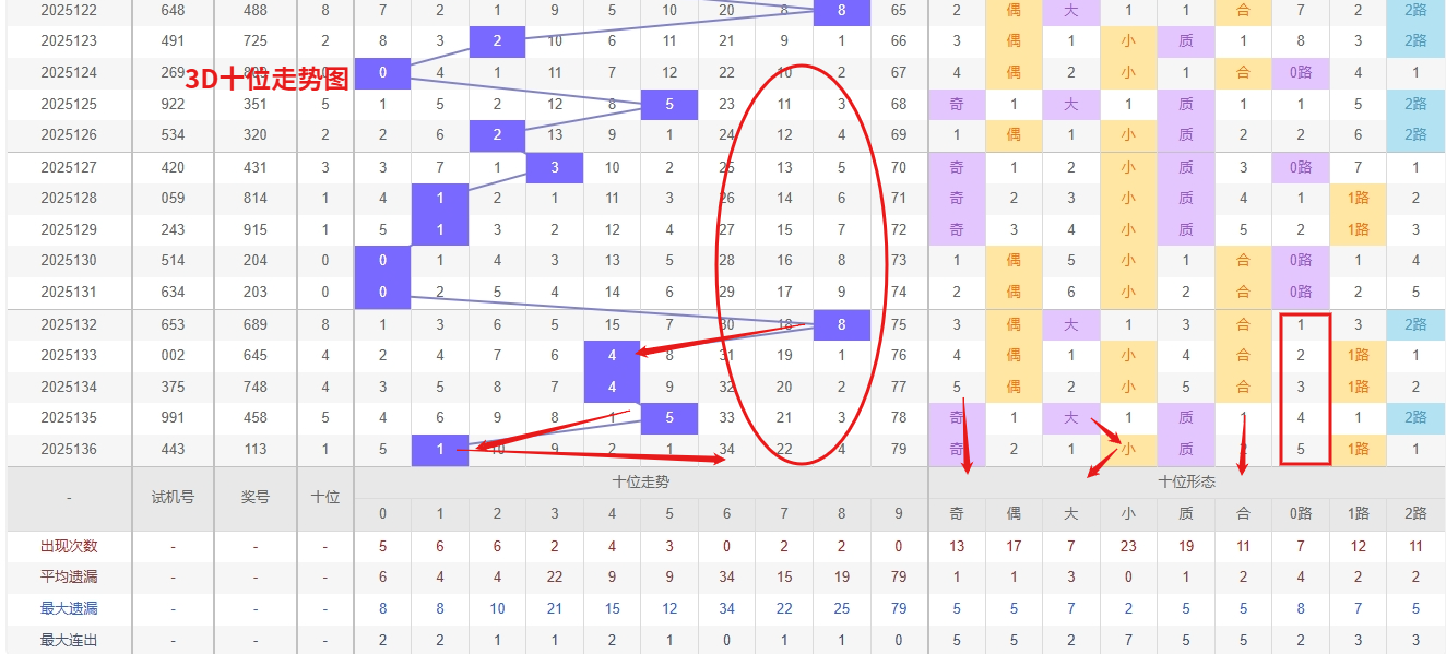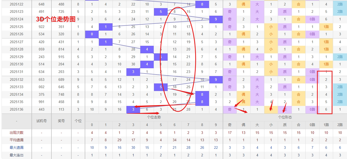 福彩3D个位分析:第2025136期个位开出号码3属于小奇数前端,从以上个位走势图中可以看出近100期的大小比约为51:49奇偶比约为54:46大小奇偶数据上有点差异有需求但不是太明显,不太好看这时就要借助连线走势和遗漏数据来帮助我们缩水号码。上期个位落号“3”小奇数0路号码球,号码开出了5振幅,连续多期的小振必被大振幅取代幅符合我们的预期,那么本期我们在个位考虑振幅走势走前依然要转变思路考虑大振幅,具体考虑(1-6)个振幅是我们主要的方向,那么在对个位落号情况进行系统的分析时我们可以明显的看到个位号码走势呈现大范围震荡,尤其是在号码的落位特点上表现的尤为突出,那么本期我们在个位分析时就要注意号码的风险,避免出现踏空。近期3D个位走势中,数字2和6持续低温,遗漏期数较长,已达到回补临界点,需重点防范其触底反弹。而数字3虽然刚刚解冻开出,但此前经历了深度遗漏,当前仍具备较强的续热动能,存在连开可能,密切追踪。投注策略上,可采取"攻守兼备"的思路,在关注3的连开趋势同时,务必对冷号2和6进行防守布局,尤其要警惕冷热交替的周期性规律,因此福彩3D第2025137期个位看好23467。本文由一起彩钱是生命动力所著,请勿转载