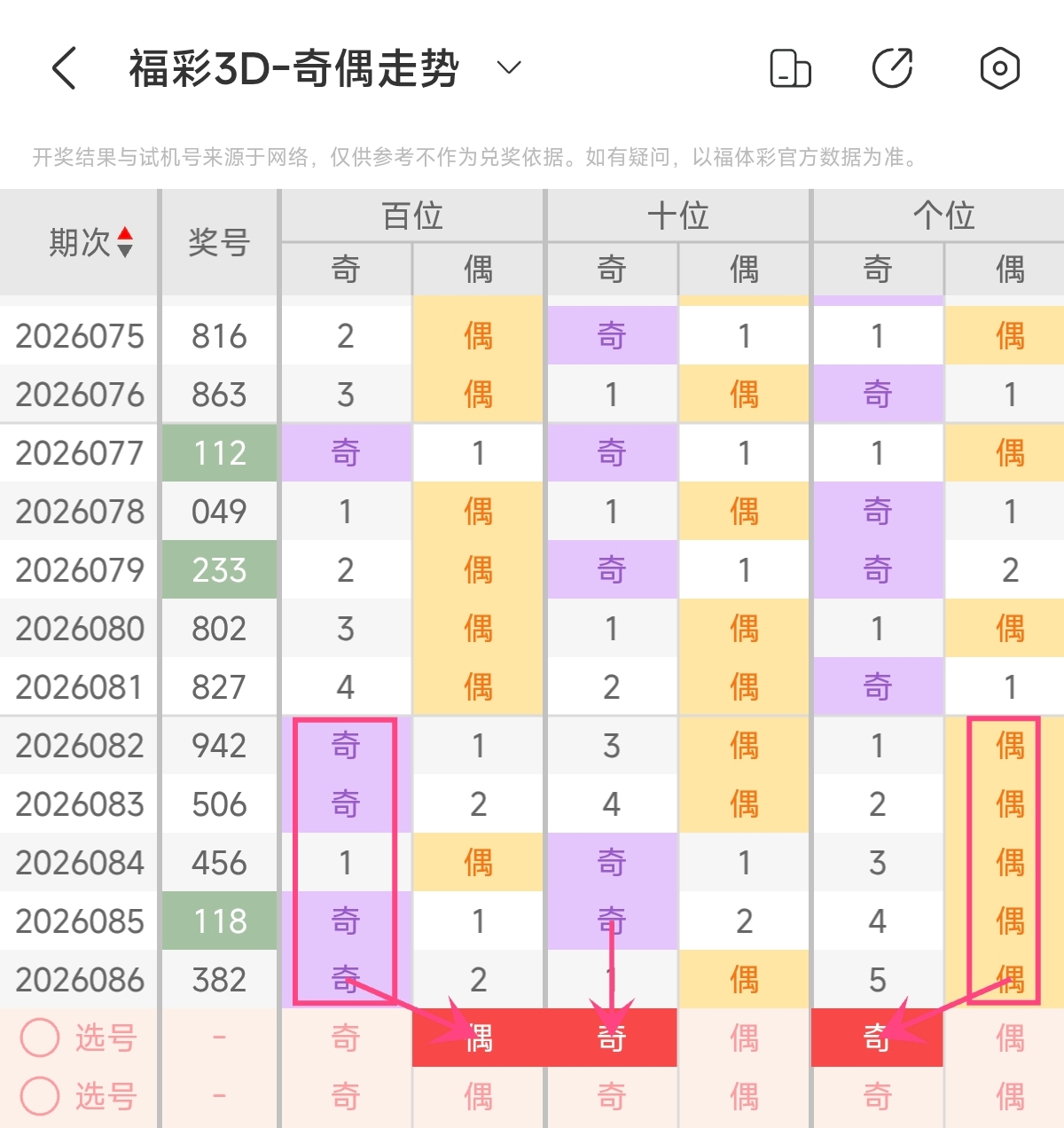 上期奇偶形态为奇偶偶,奇偶比1:2,偶数号码占优。根据近期奇偶形态变化来看,上期奇偶形态开出偶数号码占优形态,预计本期奇偶形态会有所变化,预计本期奇偶形态会开出奇数号码占优组合。预计本期奇偶形态可关注奇偶比2:1,奇数占优组合 。本期奇偶形态可重点关注:偶奇奇。