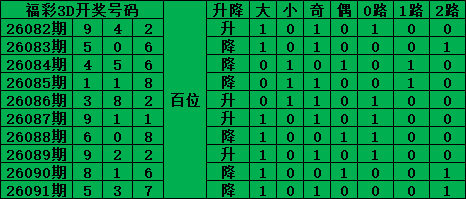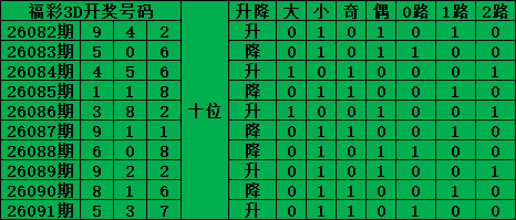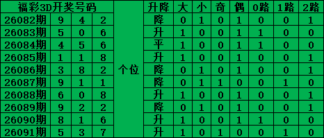 福彩3D是从0-9每期开出3个号码,截至2026091期三个位置最大遗漏的是42期的:个位的0号。