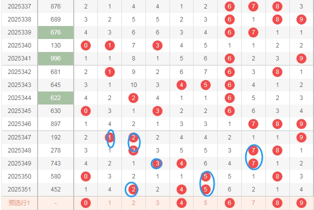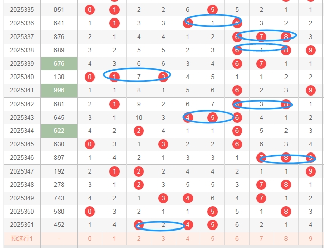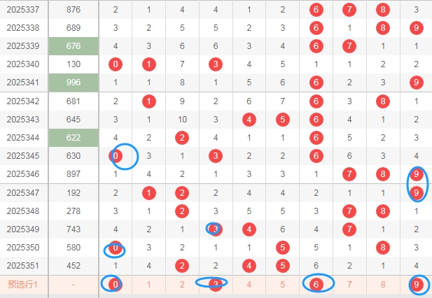 上图是福彩3D开奖号码分布走势图,我在上面走势图标注的数字是0路球的数字0 3 6 9,标注出来的蓝色圈圈表示的最近开奖号码中的0路球数字,可以发现最近0路球数字出现的少,那么本期个人觉得可以关注0路球数字0 3 6 9出1个或者2个。