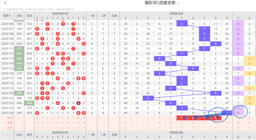 通过观察跨度及跨度属性走势可以发现:近10期内跨度大数号码出号6期,小数号码出号4期,可见近期跨度更容易开出大数号码,本期跨度大数号码继续出号可能性高,因此本期跨度仍然应该考虑大数号码出号。结合上述跨度走势图来看,本期跨度仍然看好5678等号码。
