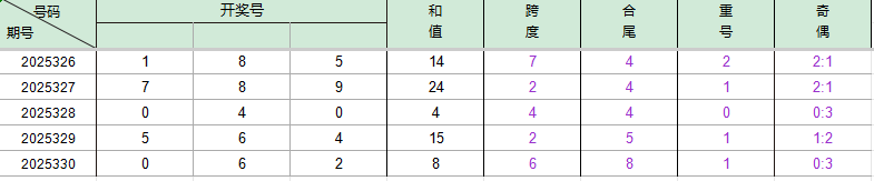 2025326期开奖号码185,我们可以看出近30期百位1出现6次,十位8出现2次,个位5出现5次(较329期减一)。