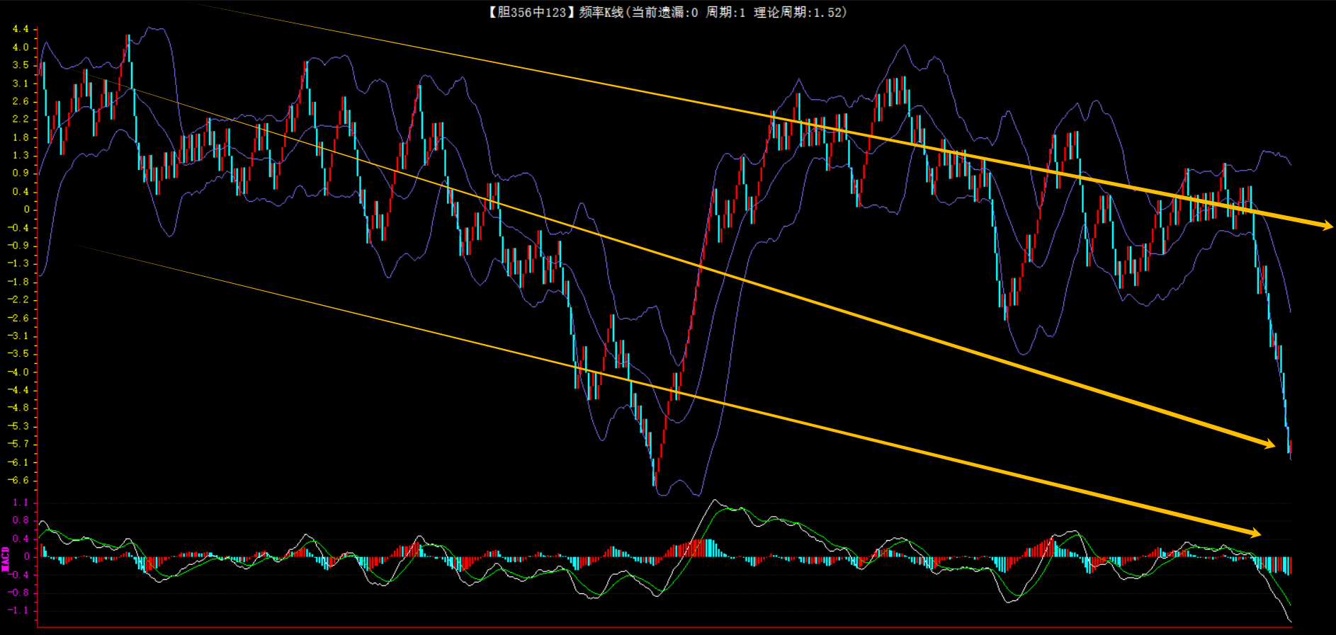 整体趋势下行,上边沿线趋势向下,下边沿趋势也是向下,节点震荡,当前开1期,本期防守。