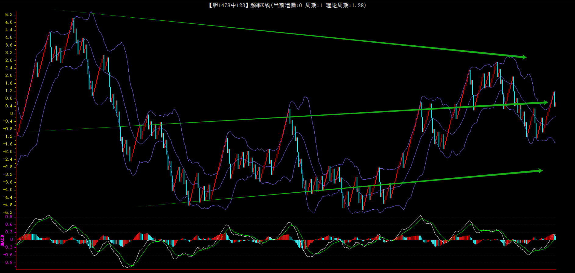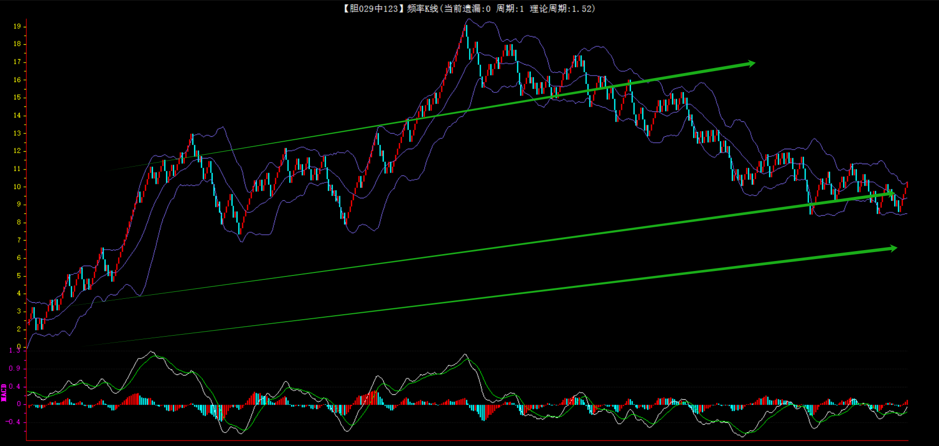 整体趋势上行,上边沿线趋势向上,下边沿趋势也是向上,节点震荡,当前开5期,本期关注。