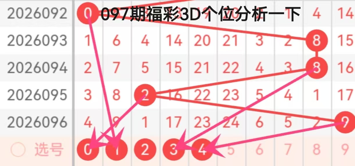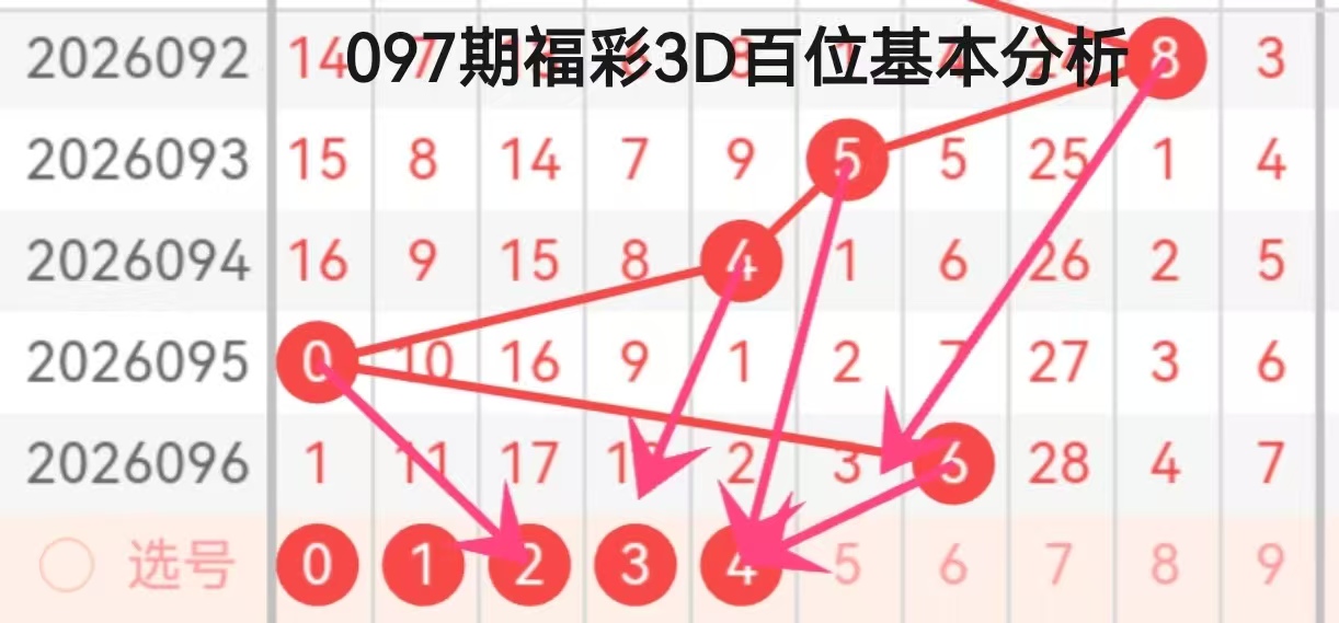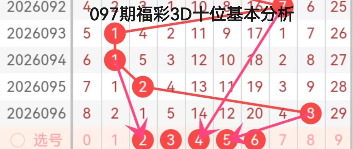从连线箭头的指向来看,095期的0和096期的6是核心指向源,箭头集中指向2、3、4三个数字,其中4号被多箭头叠加指向,成为本期百位的重点关注对象。结合近期走势规律,百位数字在低位(0)与中高段(6)之间切换后,大概率会向中段数字回归,4号既契合此前的递减延续性,也符合箭头指向的集中趋势,同时2、3号作为备选,也具备一定的回补可能性,本期百位重点关注2、3、4,核心推荐4。