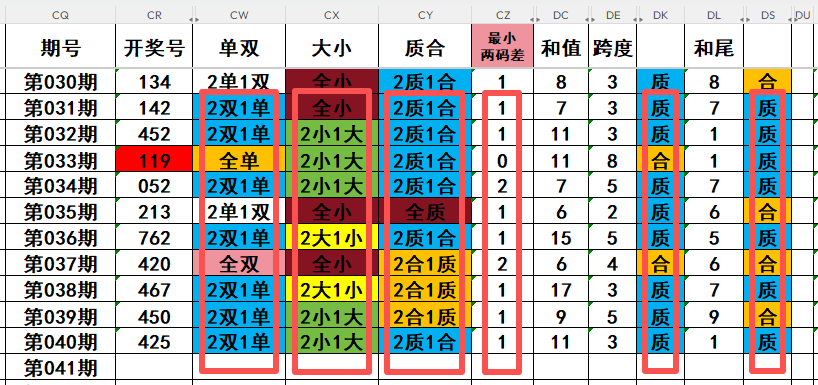 4,最近10天当中,最小两码差0开出1次,最小两码差1开出7次,最小两码差2开出2次,最小两码差3开出0次,