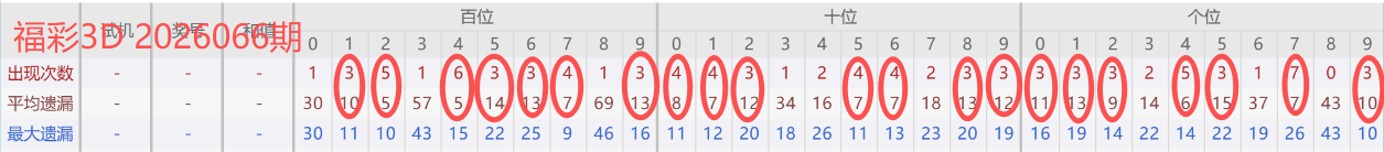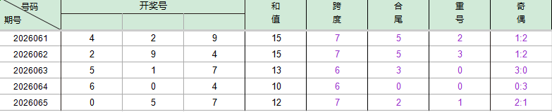2026065期开奖号码057,我们可以看出近30期百位0出现1次,十位5出现4次,个位7出现7次。