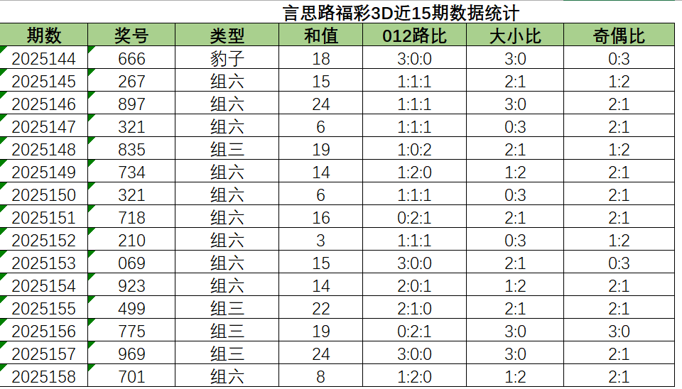 上期出的是组六,和值是8,跨度6,012路比1:2:0,大小比1:2,奇偶比2:1。