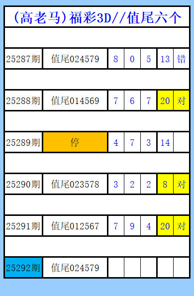 福彩3D第292期图文(高老马),值尾六个,视频上期中五胆64927