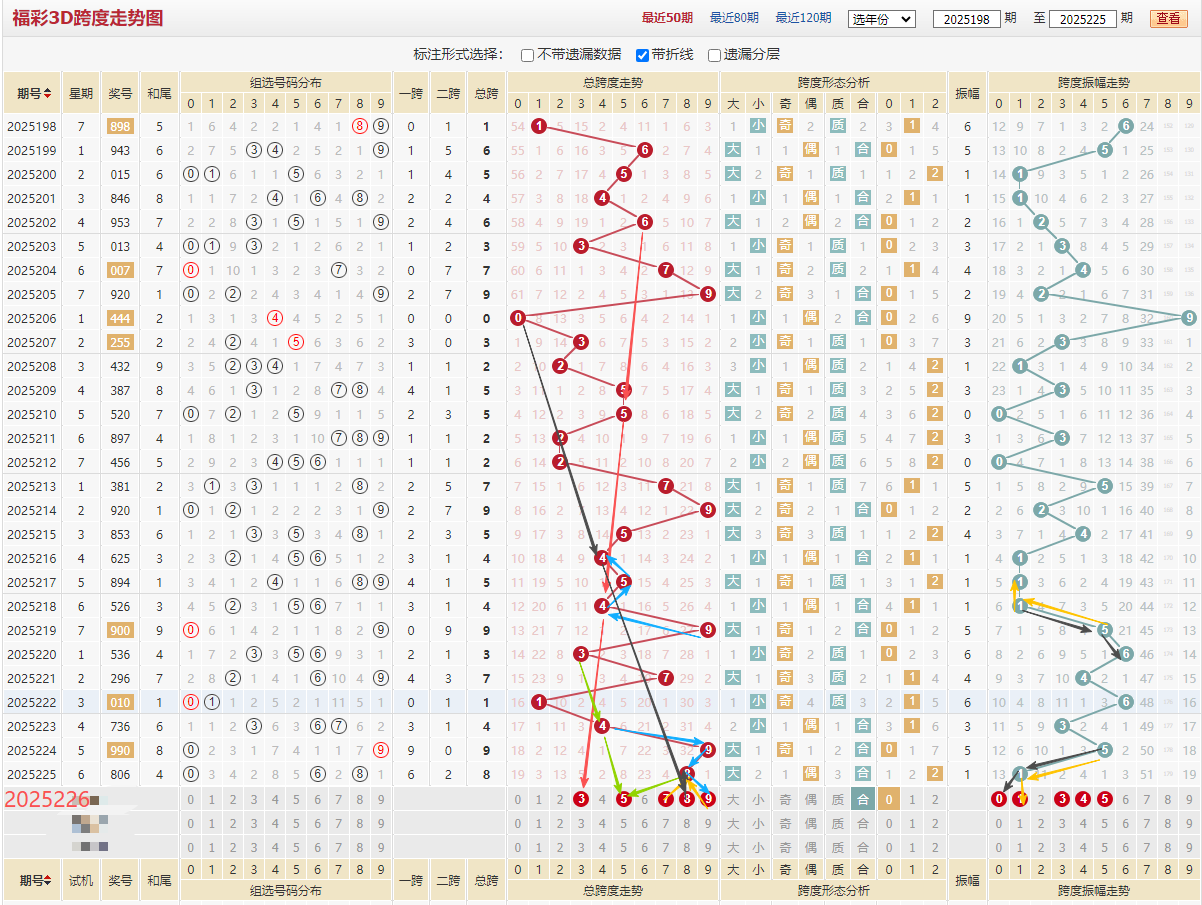 上期806开出8跨振幅1,连续开2期全合形态大跨度9-8本期重点还应放在大数跨度上,大家看上图蓝色箭头9454三角,4989同样的三角形态这个9跨可配号。再看红色箭头202期6跨,210期5跨,218期4跨,225期3跨斜线等格7期走小6543,这个3跨重点考虑。还有绿色指示345跨度,出了3期合数跨度本期质数跨度好,符合当下走势,详细跨度参考上图。综合分析关注3456789跨,226期推荐跨度:35789。