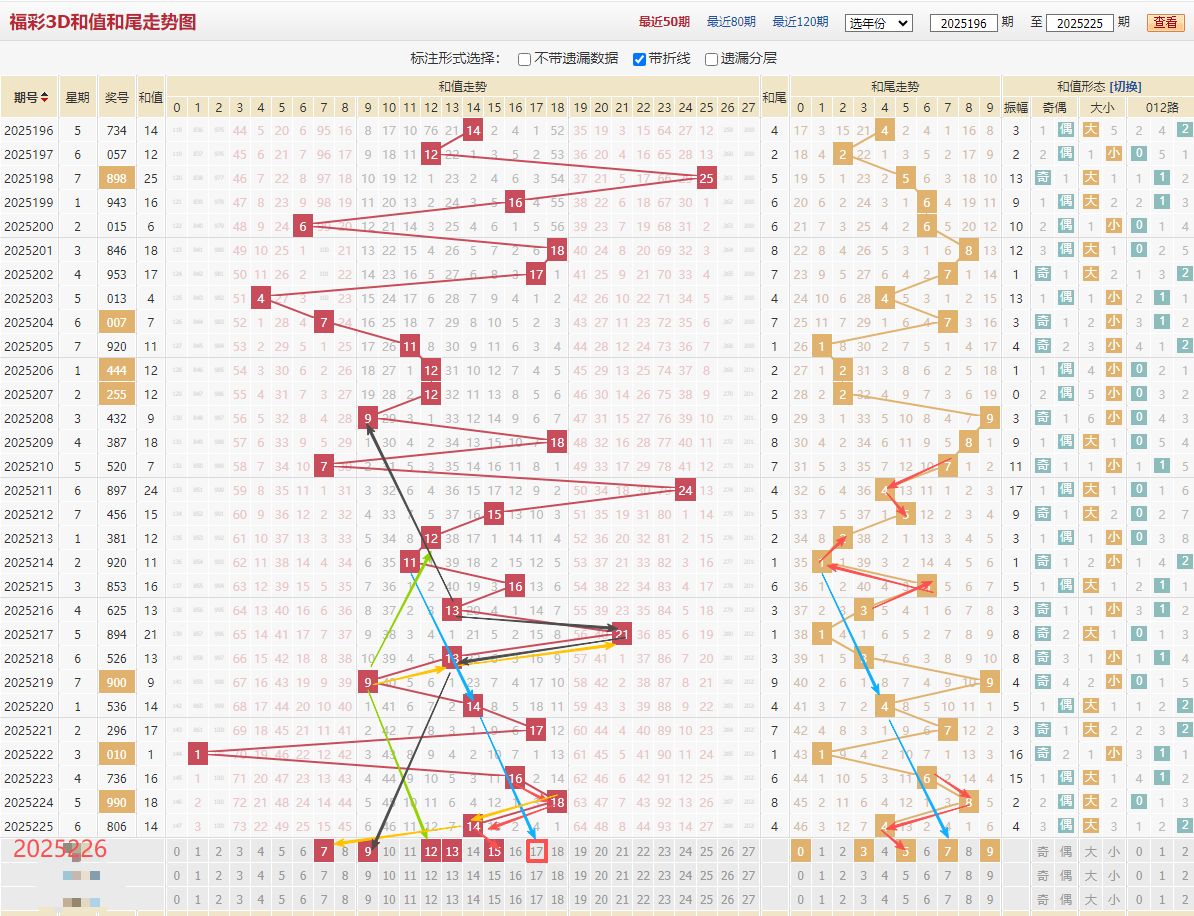 上期开出806和值14和尾4,开出全偶形态和值出现3期偶和值本期看好奇数和值,近17期也有开出重复和值本期重点关注。综合上述分析226期推荐和值尾:03579重点357,重点和值:12 13 15 17 9 7