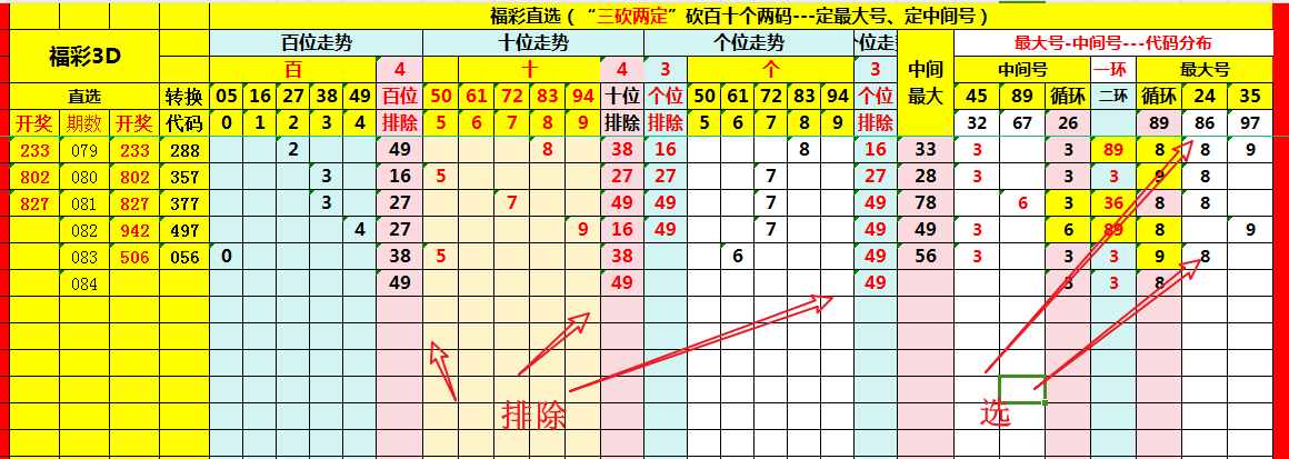 依据上述既定规则,将近期百、十、个位开出的号码,逐一对号入座,计入表格,条理清晰,有据可查;搭建研判表格如下: