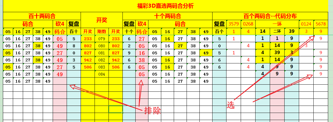 秉持化繁为简、去芜存菁之念,先将“百十、十个”三组两码合值的数字,依旧按05、16、27、38、49的规律,归为五组,化零为整。依据复盘所得的两码合数字,搭建研判表格,直观呈现,便于参考: