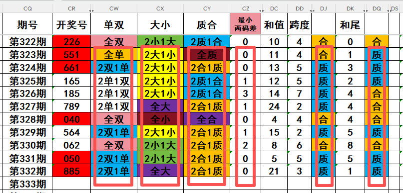 3,最近10天当中,两质一合开出2次,两合一质开出6次,全质数开出1次,全合数开出1次。近期需重点关注开奖号码两质一合的回补!