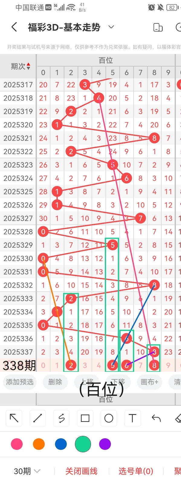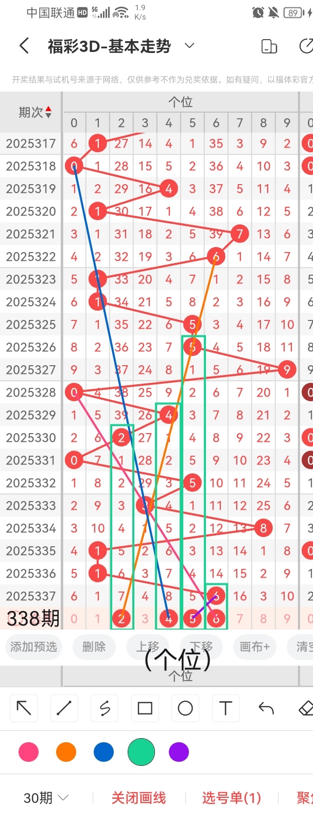 首先,小梁为了感谢各位老板的关注和打赏,特别提供一个杀个位的小技巧,同尾杀号法,准确率相当高,任何杀号都不能保证百分百哦。根据同尾杀号法,得知本期杀个位8。其次,小梁根据图中的画线分析得出,号码2与前几期开出的号码呈隔七期回补的走势且呈斜三连的走位,跨度4;号码4与前几期开出的号码呈隔八期回补的走位且呈斜三连的走势,跨度2;号码5与前几期开出的号码呈斜连的走势且呈连续隔五期回补的走势,跨度是1;号码6与前几期开出的号码呈直连回补的走位且呈斜三连的走势,跨度0。综上所述,小梁依据图中画线思路分析出本期个位可能开出的号码是:2、4、5、6。
