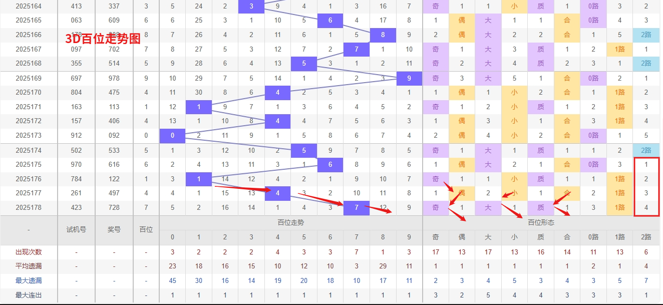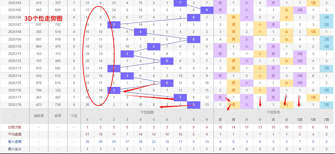 福彩3D百位分析:第2025178期百位开出号码7属于大奇数,从上面百位走势图上可以看出近100期大小比约为49:51奇偶比约为52:48。近期数据还是比较极端的符合文章开头介绍的求均衡规律非等量现象。但这种均衡不会持续最终会被偏态运行打破,然后循环往复。但短期内大小相差3点,小数过热大数有回补需求本期个人认为走大数的概率更高。上期百位落号“7”号球,在百位号码开出1路号码7后向大数方向走出3个振幅。那么通过分析上期百位落位号码分析,号码走出3个振幅,号码走为大奇数,开出1路号码7。通过对百位落号趋势来分析,百位号码落位后端,通过对近10期的走势来看百位号码大小交替频繁走3期大数又走2小数,最近大数比较强势,本期有继续走向大数号码的概率。那么本期我们在对百位号码进行分析时我个人的考虑百位号码会走出大数号码球近期3D百位走势分析显示,数字6和9呈现"温号"特征,出现频率趋于稳定,需持续关注其回补可能;而数字8作为当前"冷号",遗漏值已突破常态区间,需重点防范其触底反弹。采用"温冷搭配"策略,在关注6、9等温号延续态势的同时,对冷号8进行防守性布局,未来5期需特别留意8号可能出现的解冻信号,以及6、9的周期性热出规律。我们在百位关注的重点在02689这5个号码球上,百位号码近期奇偶切换频繁,7号球码属于1路号码奇数,现奇数开出过多有向偶数的趋势。所以福彩3D第2025179期百位看02689。