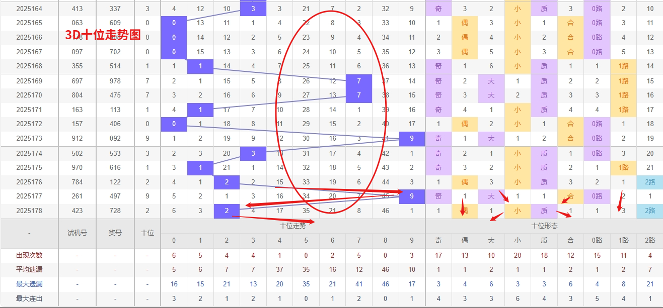福彩3D十位分析:第2025178期十位开出号码2属小偶数号码前端。以历史100期数据为例十位奇偶比约为46比54,大小比约为51比49近期大小相差7点,根据求均衡的规律开出小数的概率比大数高一点。上期我们分析奇数经过连续回补后有走偶数的可能,开出奖号2小偶数符合我们的预期。通过对十位的振幅走势来看,上期十位走出7个振幅落位号码为小偶数号码球2,那么在对本期号码进行分析时我们可以看出近期在十位落位的号码整体振幅的跨度比较大,但基本在两三个周期就要进行一次调换,那么本期十位号码走出了落位方面我们重点考虑小号码为宜,近期3D十位走势中,数字4、5、8持续低温,成为冷号,多期未出,回补概率逐渐增大,需重点防范其反弹;而0作为近期热号,表现活跃,仍需关注其延续性。采取"冷热结合"策略,在关注热号0延续的同时,适当防守冷号4、5、8的回补机会,所以福彩3D第2025179期十位推荐03458。