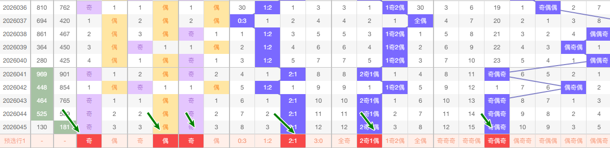 (二)、奇偶分析 奇数 13579 偶数 02468 在这5期 数据中 奇数出现 9次 偶数出现 6次 从昨天出号来看奇数占优, 本期还是看好奇数有号 看好 奇偶奇 偶奇奇