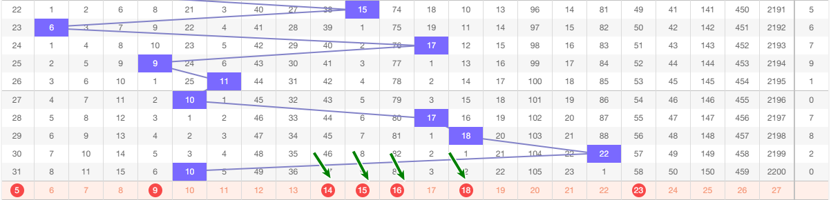 本期看好 范围5-23 之间定和值9-14-16-18从图上来看近5期的和值 10 17 18 22 10 10 22 10 为1路和值 18 0路和值 17 2路和值 本期看好2路和值参考 这五期和值波动不大 下期防守大波动