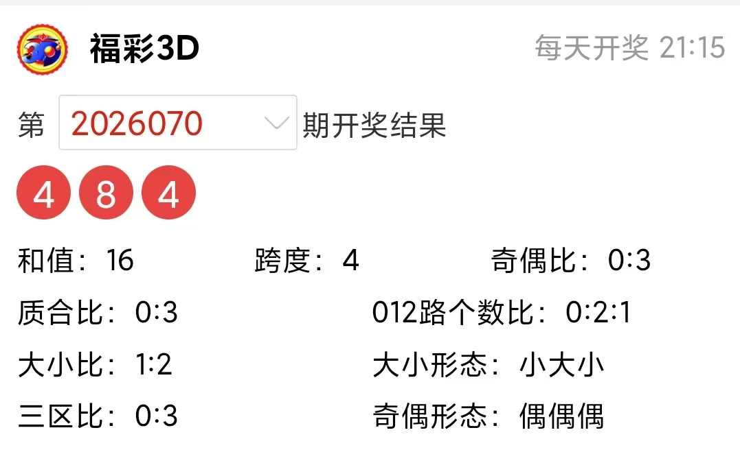 福彩3D上期(2026070期)开奖号码详情